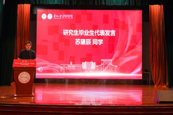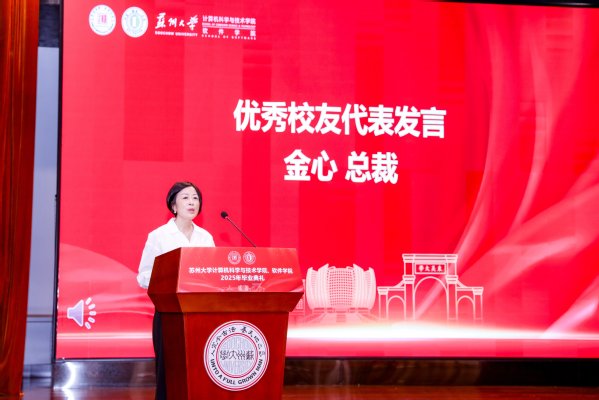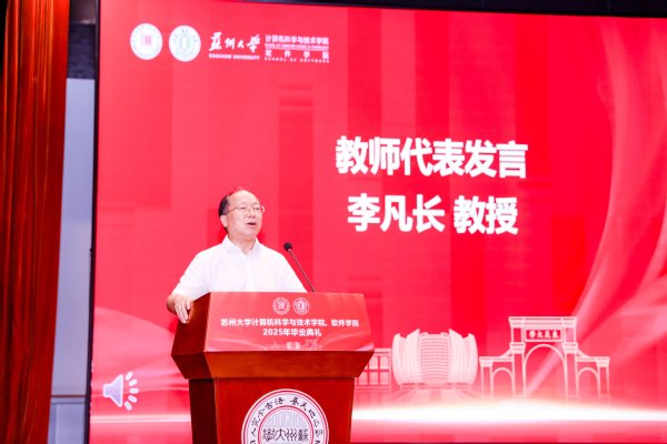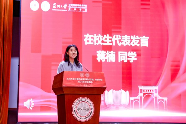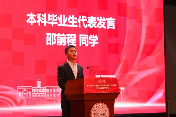 2021级计算机科学与技术专业的邵前程同学作为本科毕业生代表发言,他回顾了从初入校园的青涩到即将走向社会的成熟蜕变,同时表达了对国产a片 和老师悉心培养的感激,并鼓励同学们不忘初心,勇敢迎接未来的挑战。2022级计算机科学与技术专业硕士研究生苏肇辰同学作为研究生毕业生代表发言,他分享了在校期间的学习和科研感悟,并号召同学们铭记“养天地正气、法古今完人”的苏大校训,在未来的工作和生活中继续发挥专业所长,为社会贡献力量。2023级人工智能专业的蒋楠同学作为在校生代表发言,她向即将毕业的学长学姐送上诚挚的祝福,感谢他们的榜样力量,并表示将传承他们留下的“精神代码”,在今后的学习中不断努力,砥砺前行。国产a片 1988级校友金心作为优秀校友代表发言,金心总裁结合自身成长与职业发展的经历,勉励学弟学妹们在新时代的广阔舞台上善于抓住机遇,在不断奋斗中成长为勇担时代使命的有为青年。国产a片 李凡长教授作为教师代表发言,李教授以一个富有创意的数学公式为引,从不确定性、可持续性、复杂性与稳定性四个角度,寄语毕业生们坚定信念、勇敢前行、持续进步、追求平衡。随后,毕业生代表顾斯佳和孙家杨向国产a片 赠予礼物,以此表达对国产a片 辛勤培育的感激之情。