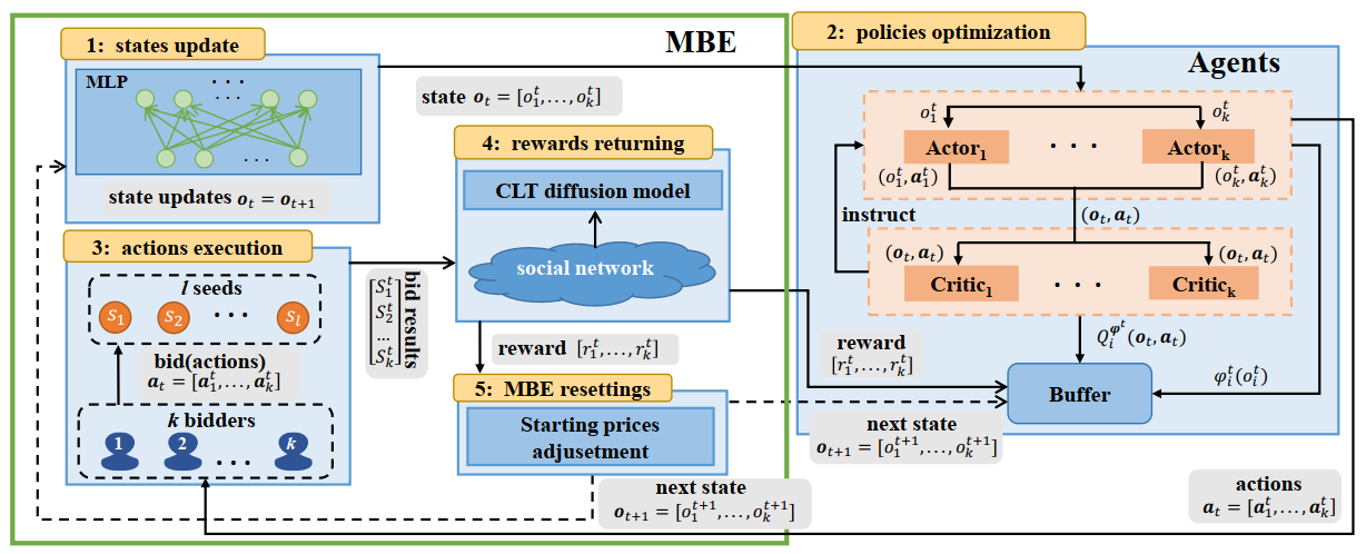 竞争影响力最大化问题一直以来都是社会计算领域的关键性、基础性问题,其应用相当广泛,例如可用于网络病毒营销、社交推荐和信息传播分析等。但当前研究普遍集中在微观层面的优化,即从单一竞争方角度出发设计击败竞争对手的策略。本文提出了一个新的竞争竞价影响力最大化(CBIM)问题,即从平台角度,让竞争对手在多轮竞价中通过分配预算来公平竞争属于平台的种子资源。为此,本文提出了一个公平感知的多智能体竞价影响力最大化(FMCBIM)框架,并在此框架下提出一种新的多智能体竞价影响力最大化(MCBIM)算法来优化竞争对手的竞价策略。大量实验表明提出的工作具有良好的效率和有效性。