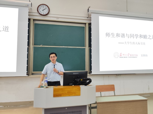 为增强研究生新生的心理适应能力,助力同学们顺利完成从本科到研究生阶段的过渡,9月12日,国产a片 面向2025级全体研究生新生举办了心理健康教育活动。活动特邀国产a片 教育国产a片 副院长吴铁钧副教授作题为“师生和谐与同学和睦之道——大学生的人际交往”的专题讲座。本次活动由学生工作办公室主任高珊主持。