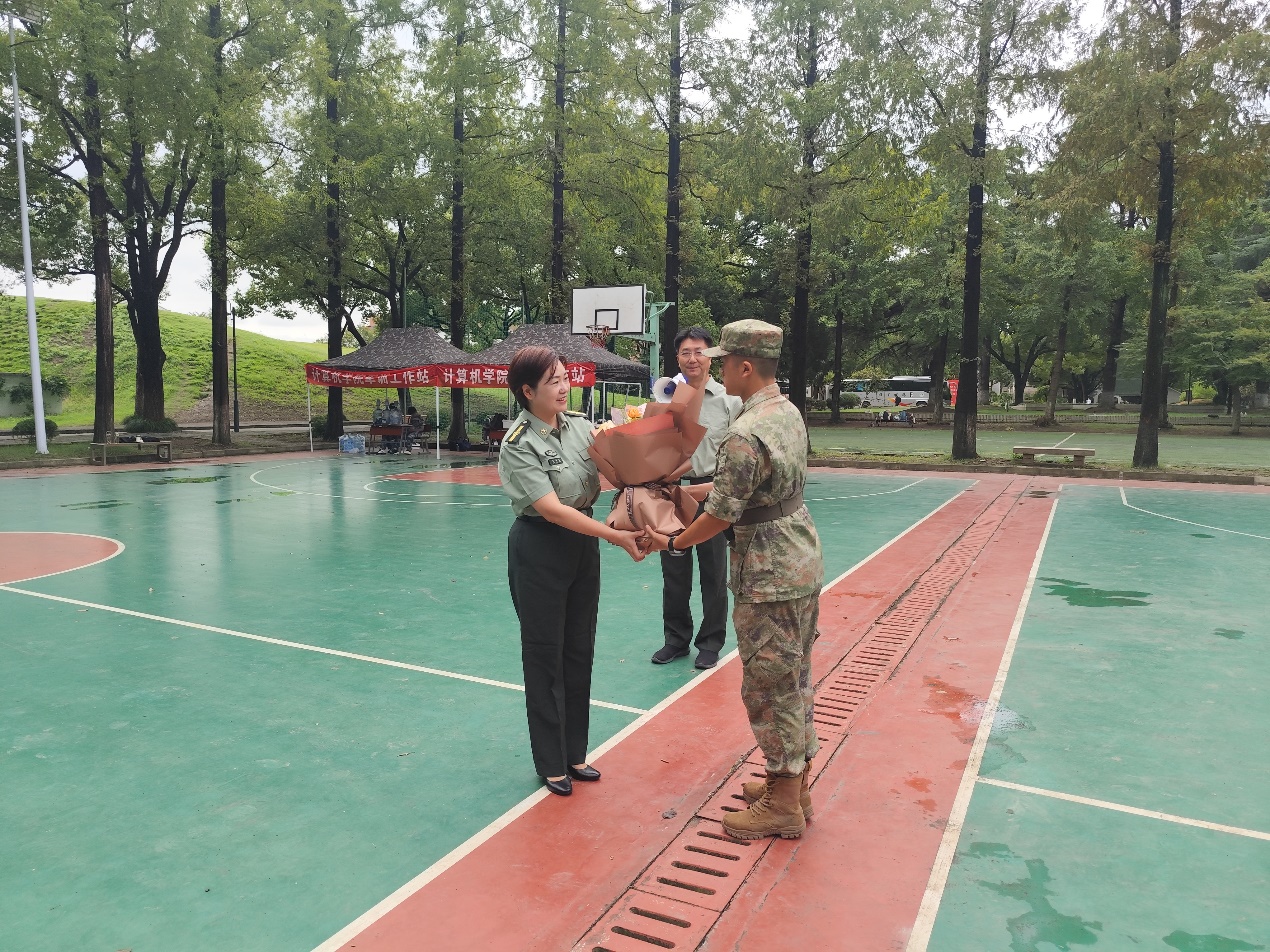 连日高温为军训带来严峻挑战,多名参训学生及一位教官因在烈日下持续训练出现中暑症状。警报声中,训练暂停,师生肃立。董召勤详细了解他们的身体恢复情况,充分肯定了教官恪尽职守的精神与学生意志坚韧的品质。宋海英特别为带病坚持训练的教官送上鲜花,对其致以诚挚的慰问与敬意,并反复叮嘱学生务必科学施训、防暑降温,将健康安全放在首位。