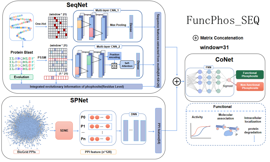 该模型由两个特征编码子网络(SeqNet和SPNet)和一个特征组合子网络(CoNet)组成。通过测试不同的序列特征和模型组合,在SeqNet中采用One_Hot、PSSM编码及保守性特征来构建磷酸化位点所处基序的特征图谱。使用CNN框架来自动提取二维矩阵的序列特征信息,在One_Hot通道增加最大池化层减小来自上层隐藏层的计算复杂度;在PSSM通道增加位置嵌入和自注意力机制,添加残基的绝对或相对位置信息来进一步捕捉蛋白质序列中残基之间的长距离依赖关系和全局信息。在SPNet中通过SDNE网络嵌入方法对PPI网络进行编码学习蛋白质之间的非线性关系,并通过DNN框架优化PPI网络特征, 为磷酸化位点功能提供蛋白质层面的上下文信息;最后在CoNet中使用FNN对输入的特征进行非线性变换,在网络最后一层使用Sigmoid激活函数用于预测磷酸化位点具有功能的概率。对于不平衡问题,对阴性数据集随机下采样11次,并在具有不同阳性与阴性数据比率的测试集上进行预测。结果表明FuncPhos-SEQ在不同的测试集上均能对磷酸化位点的功能(包括调控活性、调控互作及非特异功能)均能获得较好的预测效果。