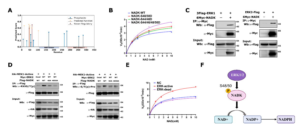使用FuncPhos-SEQ对NADK上的磷酸化位点进行打分,其N端loop区的S15、S44、S46、S48、S50、T62、S64和S103上的磷酸化位点作为功能位点排名较高。为了验证这几个位点的功能,研究人员首先在293T细胞中过表达NADK,通过质谱鉴定发现S48/50磷酸化修饰最强。进而将S48/50突变为D,发现突变体的酶活较WT增强。为了确定哪些激酶负责NADK-S48/50的磷酸化,在293T细胞中过表达Flag-NADK蛋白,并使用Co-IP结合质谱分析来鉴定潜在的NADK相互作用蛋白,结合文献报道,发现MAPK家族的ERK1/2可能是磷酸化NADK的激酶。借助Co-IP和Pull-down技术进一步确证了NADK和ERK的相互作用。最后经过体外酶活验证,ERK2通过磷酸化NADK-S48/50激活NADK的酶活,进一步调控细胞内NADPH含量。