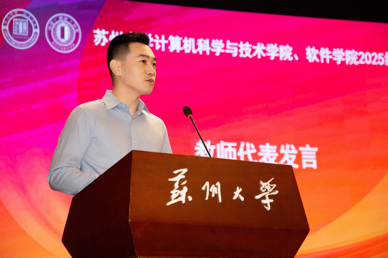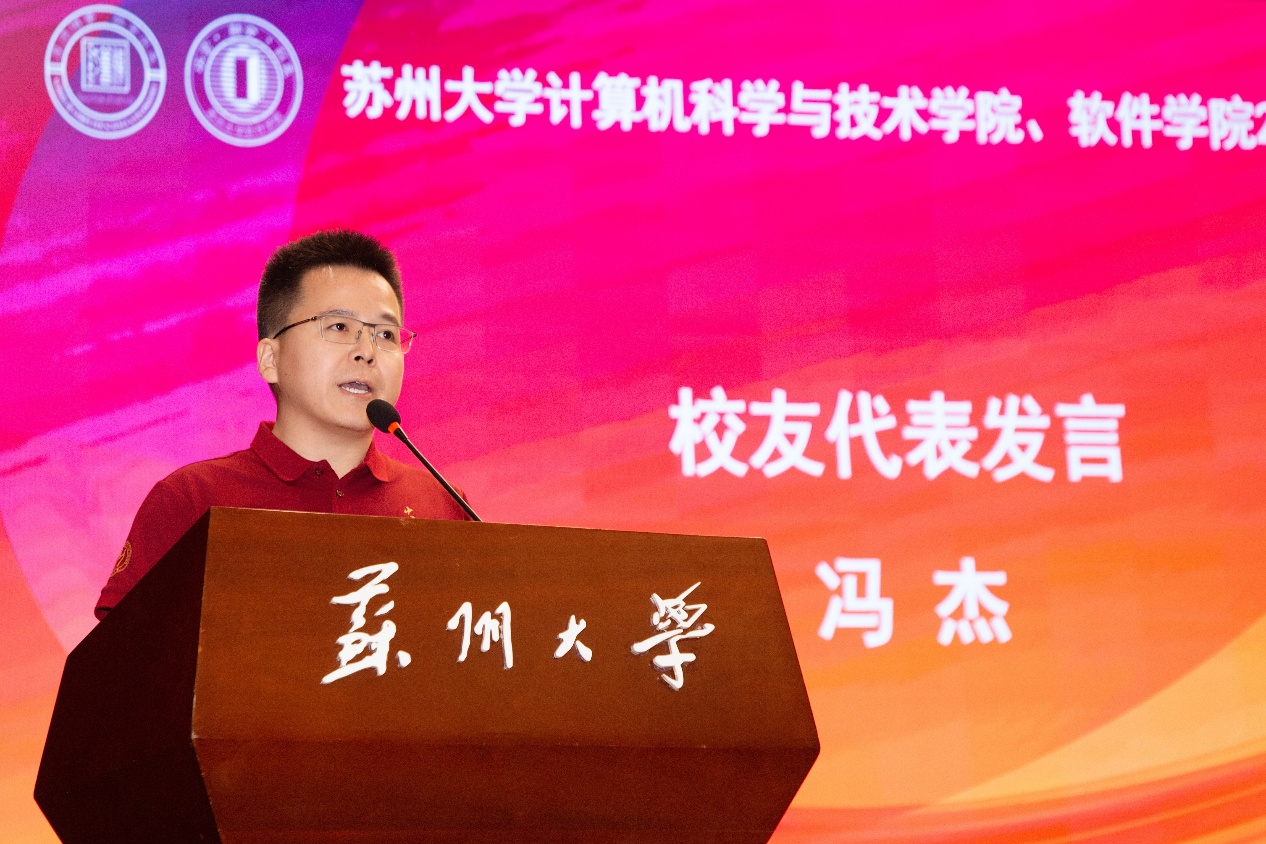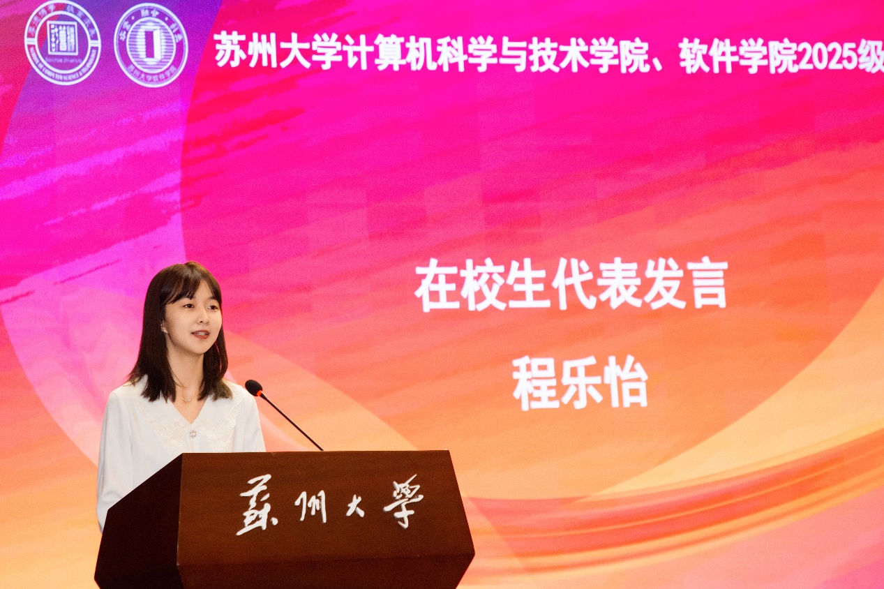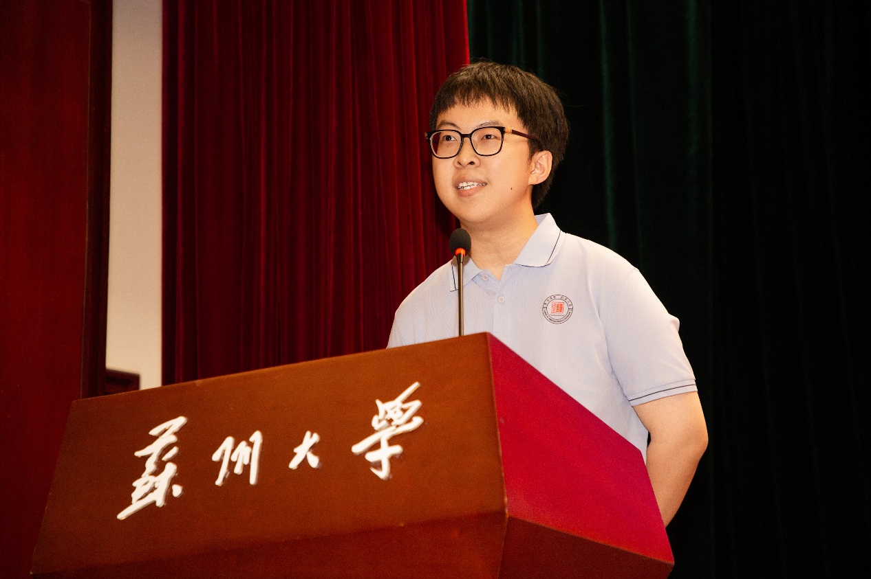 在校生代表、2022级软件工程专业程乐怡同学结合自身学习与科创经历,以“探索精神、科创精神、责任意识”为关键词,鼓励学弟学妹勇于尝试、敢于突破,在苏大这片沃土上书写属于自己的青春篇章。