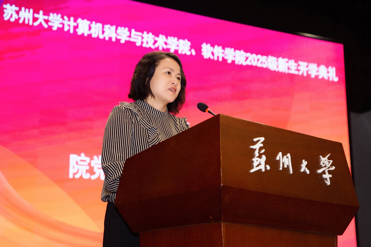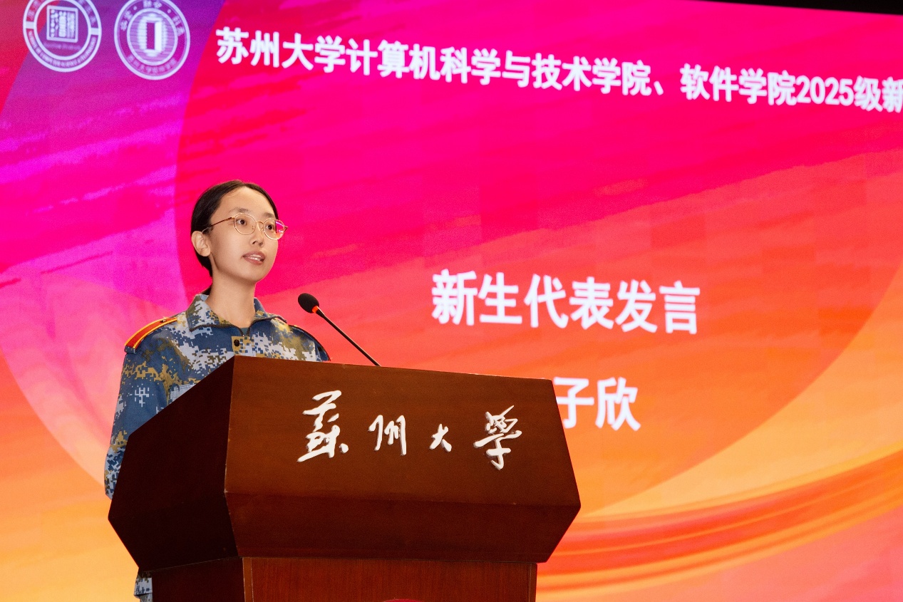 典礼在雄壮的国歌声中拉开帷幕,全体师生肃立齐唱国歌,展现出昂扬向上的精神风貌。随后,现场播放了由新生自编自导的入学视频《砺剑·铸芯》,镜头记录下同学们入学教育以及军训期间的坚毅身影与青春风采,也为大学生活奏响了奋进的序曲。新生代表、计算机科学与技术专业王子欣同学在发言中回顾了十二载寒窗的拼搏历程,表达了对苏大深厚底蕴与优良学风的向往。她呼吁同学们在人工智能迅猛发展的时代背景下,不仅要掌握专业知识,更要提升解决问题的能力,做好终身学习的准备,“用代码书写对祖国最清澈的爱”。