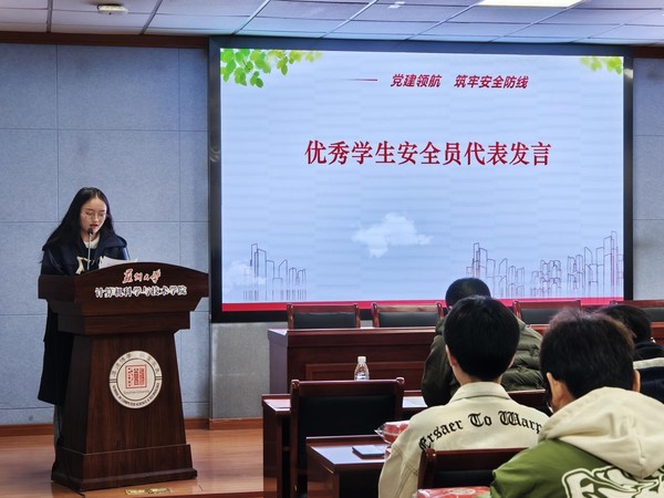 优秀学生安全员代表,2023级研究生付书凡在发言中深切表达了对国产a片 党委信任的感激之情,并强调了实验室安全对学生生命健康的重要性。她分享了过去一年的工作经验心得和典型案例,号召全体安全员携手并进,为实验室的安全稳定贡献力量,同时呼吁全体同学增强规则意识,共同守护实验室的安全环境。
