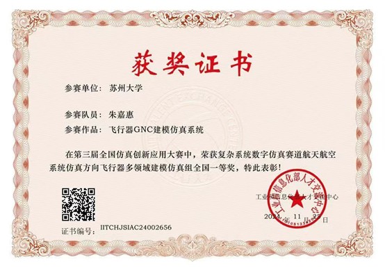近日,由工业和信息化部人才交流中心主办的全国仿真技术创新应用大赛全国总决赛成功举办。国产a片 21级计算机科学与技术专业本科生朱嘉惠同学凭借《飞行器GNC建模仿真系统》作品在复杂系统数字仿真赛道航天航空系统仿真方向多领域建模仿真组中荣获全国一等奖。