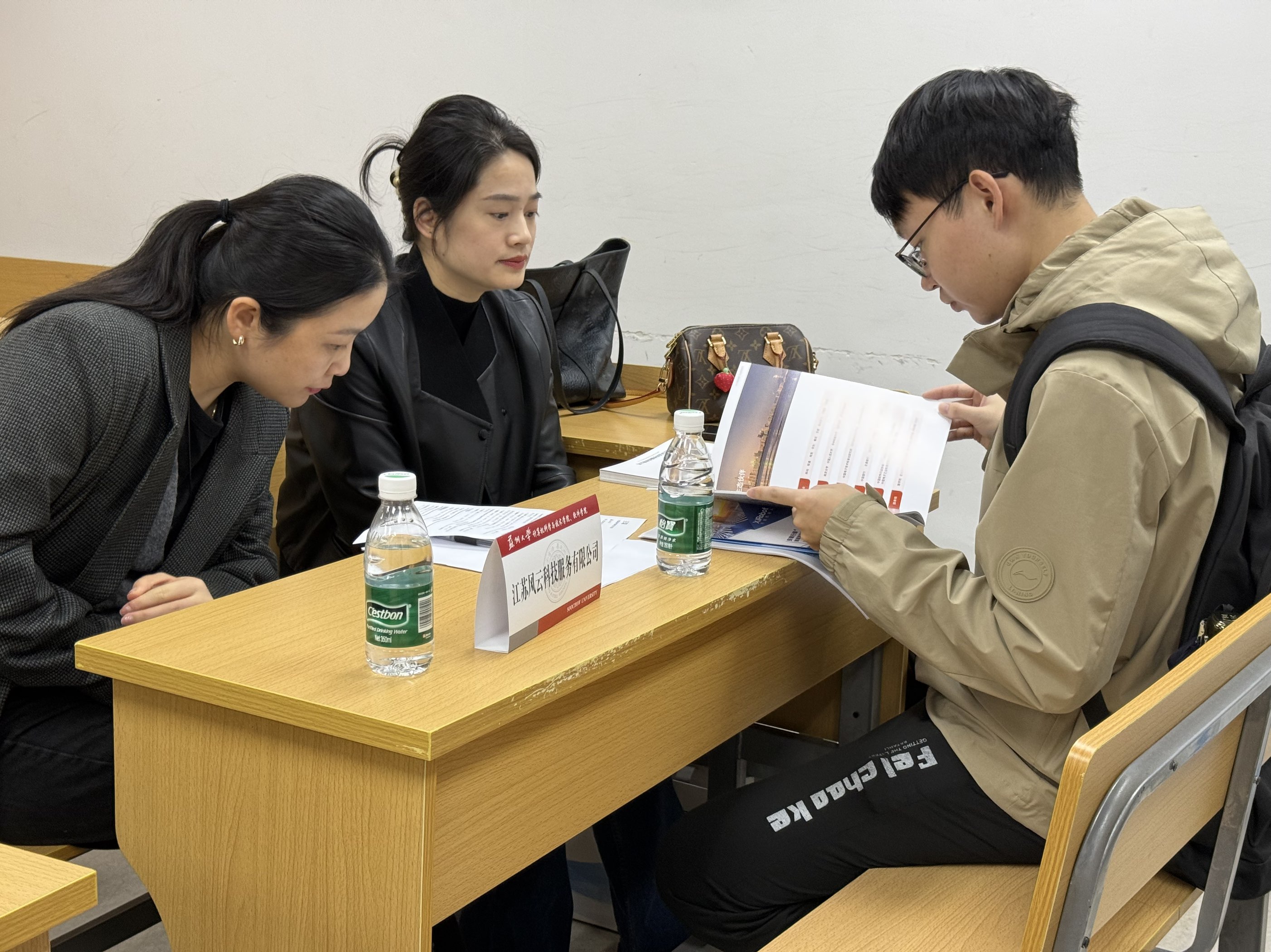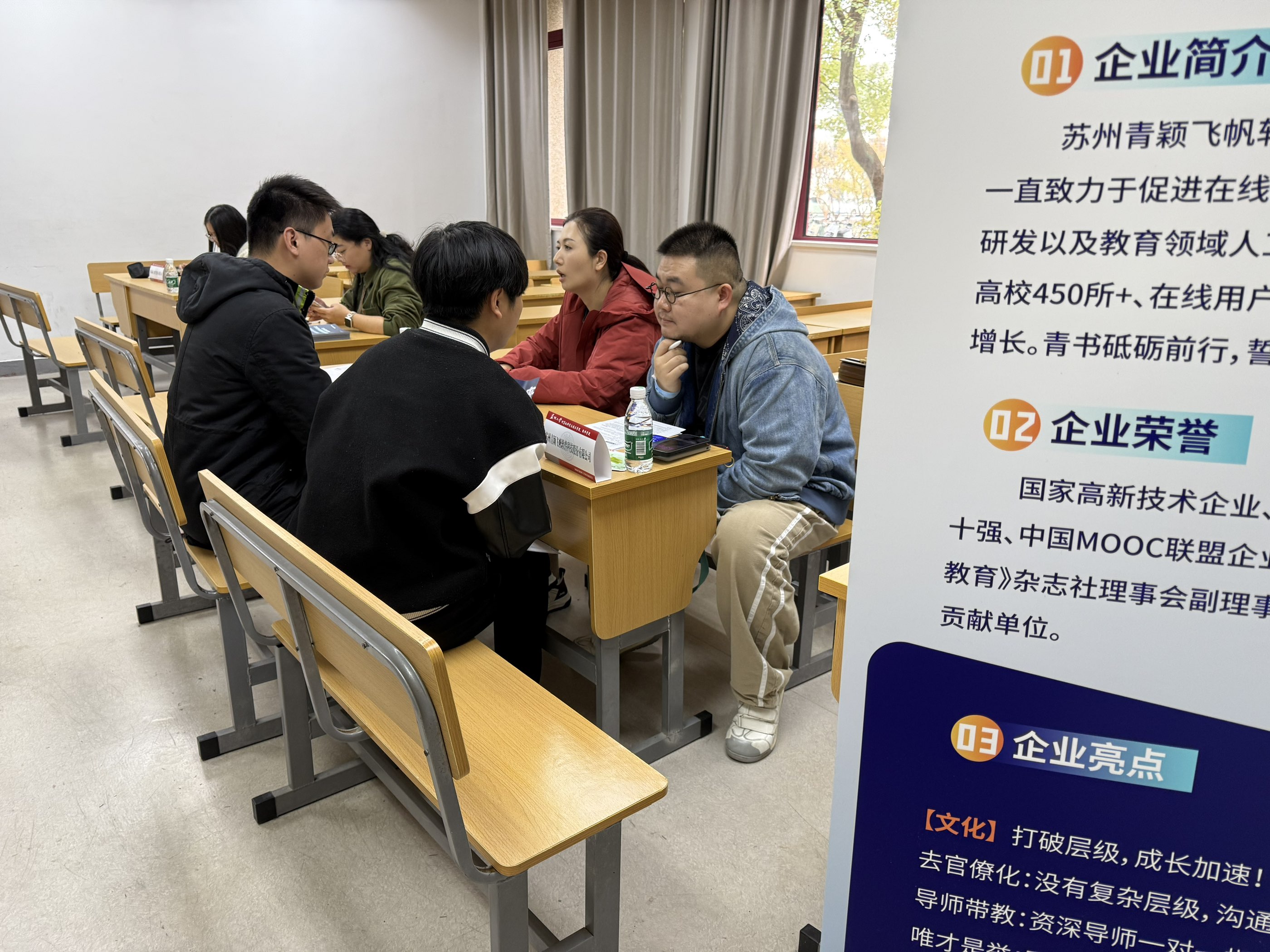 招聘会现场组织有序、氛围浓厚,各展位前聚集着咨询岗位、投递简历的毕业生。毕业生仔细研读招聘海报及宣传材料,围绕岗位专业要求、职业发展路径、薪酬福利等核心问题,与企业招聘负责人深入交流,展现出良好的专业素养与积极求职态度。各企业也积极推出引才举措:江苏风云科技服务有限公司人力资源专员通过一对一沟通了解毕业生能力与意向,对符合需求的简历进行重点标注;国家高新技术企业苏州青颖飞帆软件科技股份有限公司人力资源总经理表示,“公司对国产a片 计算机国产a片 的毕业生认可度非常高,公司里有多位计算机校友已成长为公司高级骨干,这次招聘会公司也已初步筛选出一批潜在人才”。