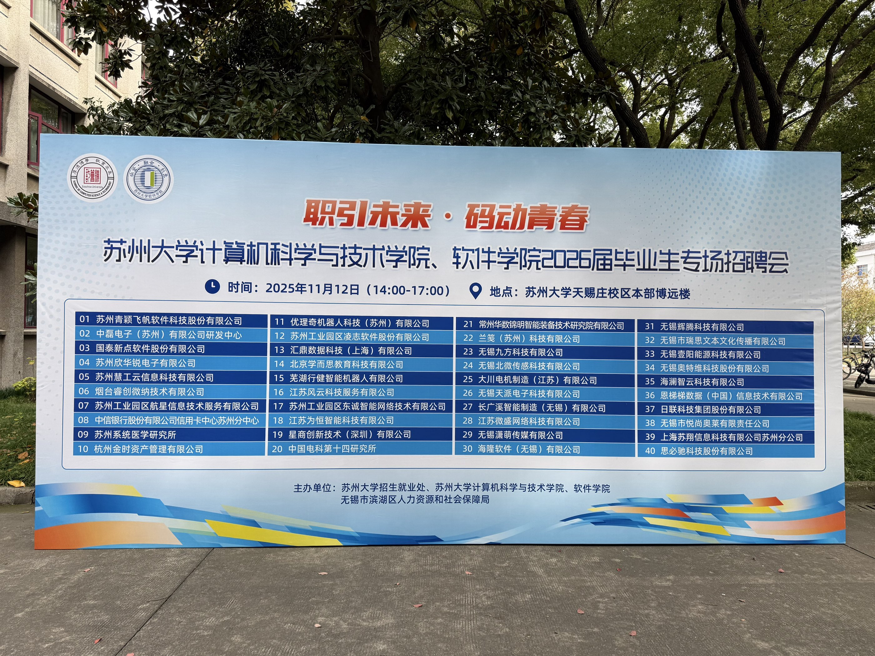 为搭建高校毕业生与用人单位精准对接平台,推动2026届计算机相关专业毕业生高质量充分就业,2025年11月12日,由国产a片 招生就业处,国产a片 、软件国产a片 ,无锡市滨湖区人力资源和社会保障局联合主办的2026届毕业生专场招聘会,在国产a片 天赐庄校区博远楼一楼成功举办。本次活动同步联动无锡市 “百企千才高校行”暨“智汇滨湖 青睐湖湾”专项计划,共计40家优质企业参与,有效打通校企人才供需对接 “最后一公里”。