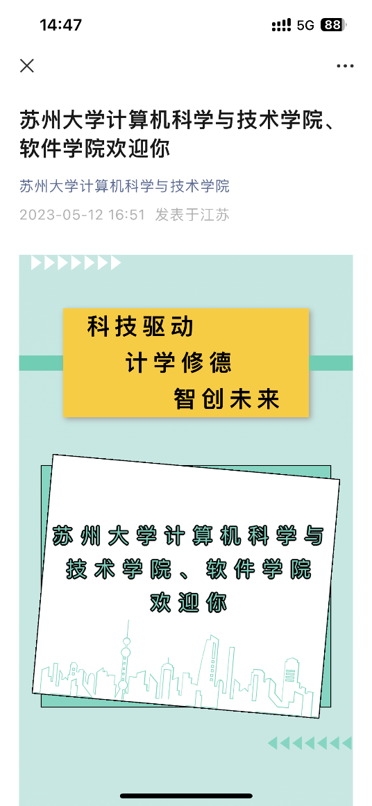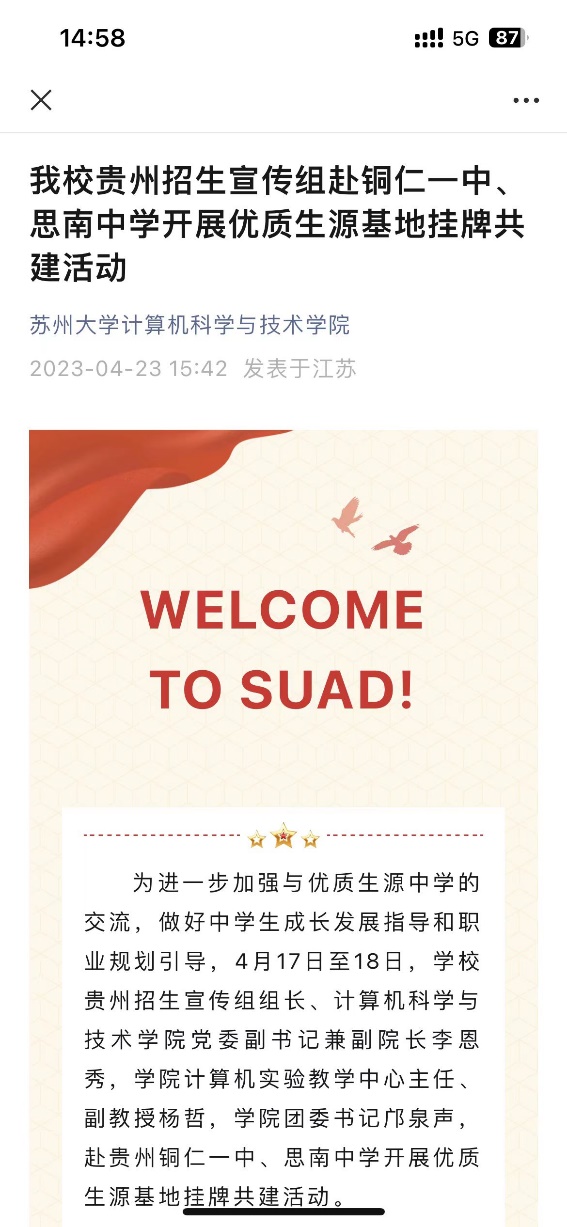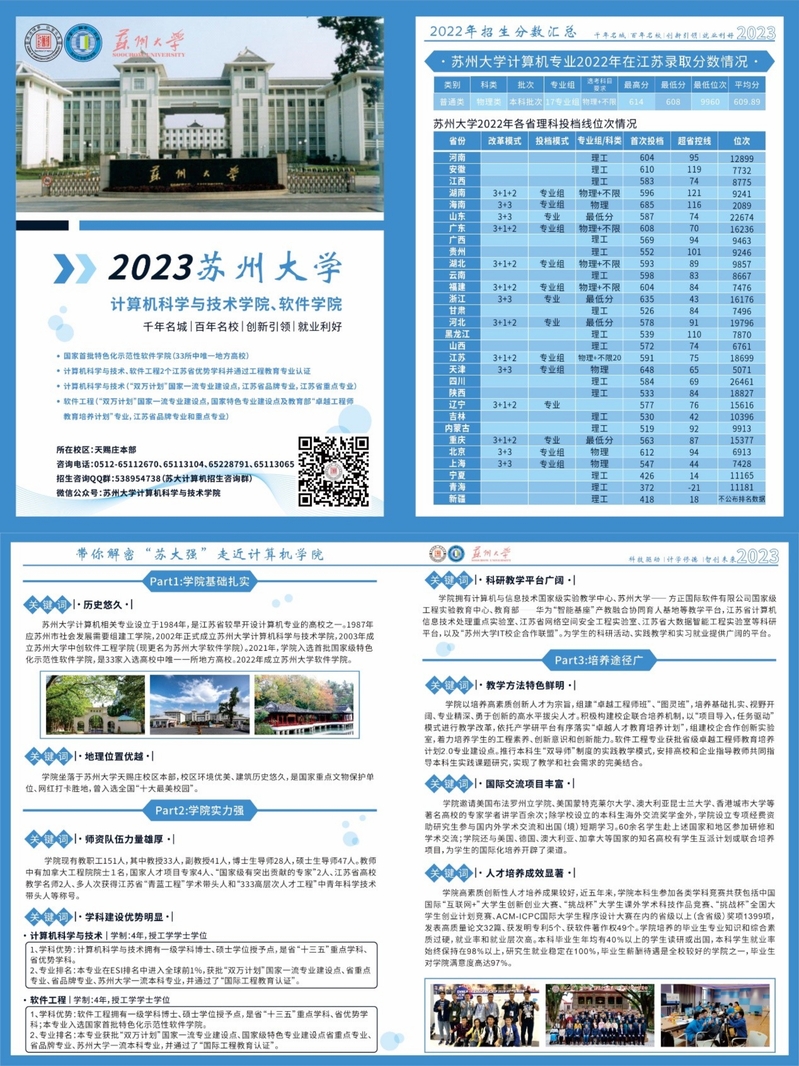 为深入落实《国产a片 加强本科招生宣传工作的实施意见》文件精神,加大国产a片 招生宣传力度,提升招生宣传效果,鼓励更多优质生源报考国产a片 ,给广大家长和考生与苏大零距离交流的机会,国产a片 、软件国产a片 各科室多维联动、协同发力,扎实有效地深入开展2023年招生宣传工作。国产a片 党委书记胡新华指导,副书记、副院长李恩秀具体负责,各专业教师代表、全体辅导员老师以及学生志愿者组成2023年招生宣传分队,通过PPT专业介绍、新闻推送、科普讲座、线下招生咨询会、生源中学实地走访和高招交流大会等多种形式,在贵州、内蒙古两地全方位、多角度开展本科招生宣传工作。