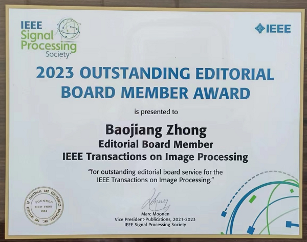 钟宝江教授被IEEE信号处理学会授予 “2023年度杰出编委奖”<br/>(OUTSTANDING EDITORIAL BOARD MEMBER AWARD)