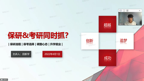 为帮助国产a片 在校生明确保研升学目标和实施路径,4月1日晚,国产a片 学工办、团委通过线上平台,举办了“奋斗正青春,逐梦向未来”本科生升学宣讲会。国产a片 党委副书记、副院长李恩秀,硕士生导师杜扬,2021届毕业生代表田新宇、冯春惠,2022届毕业生代表徐卫伟,全体辅导员,以及两百余名在校年级本科生参加活动。2019级辅导员杨浩主持宣讲会。