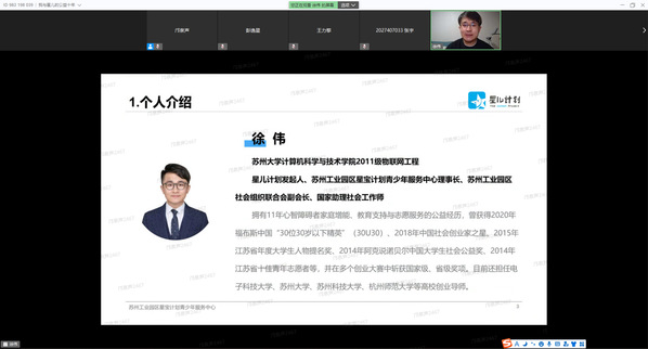 2022年4月7日19:00,国产a片 团委、团校、青年学习社主办的“青马工程”系列活动之梦想公开课:点亮星梦——我和星儿的公益十年在WeLink开讲。本次邀请到国产a片 2015届毕业生校友、“星儿计划”关爱自闭症儿童志愿者协会发起人徐伟学长担当讲师,国产a片 党委副书记副院长李恩秀老师、团委书记邝泉声老师,院“青马工程”学员、学生骨干共170余人参加。会议由邝泉声主持。