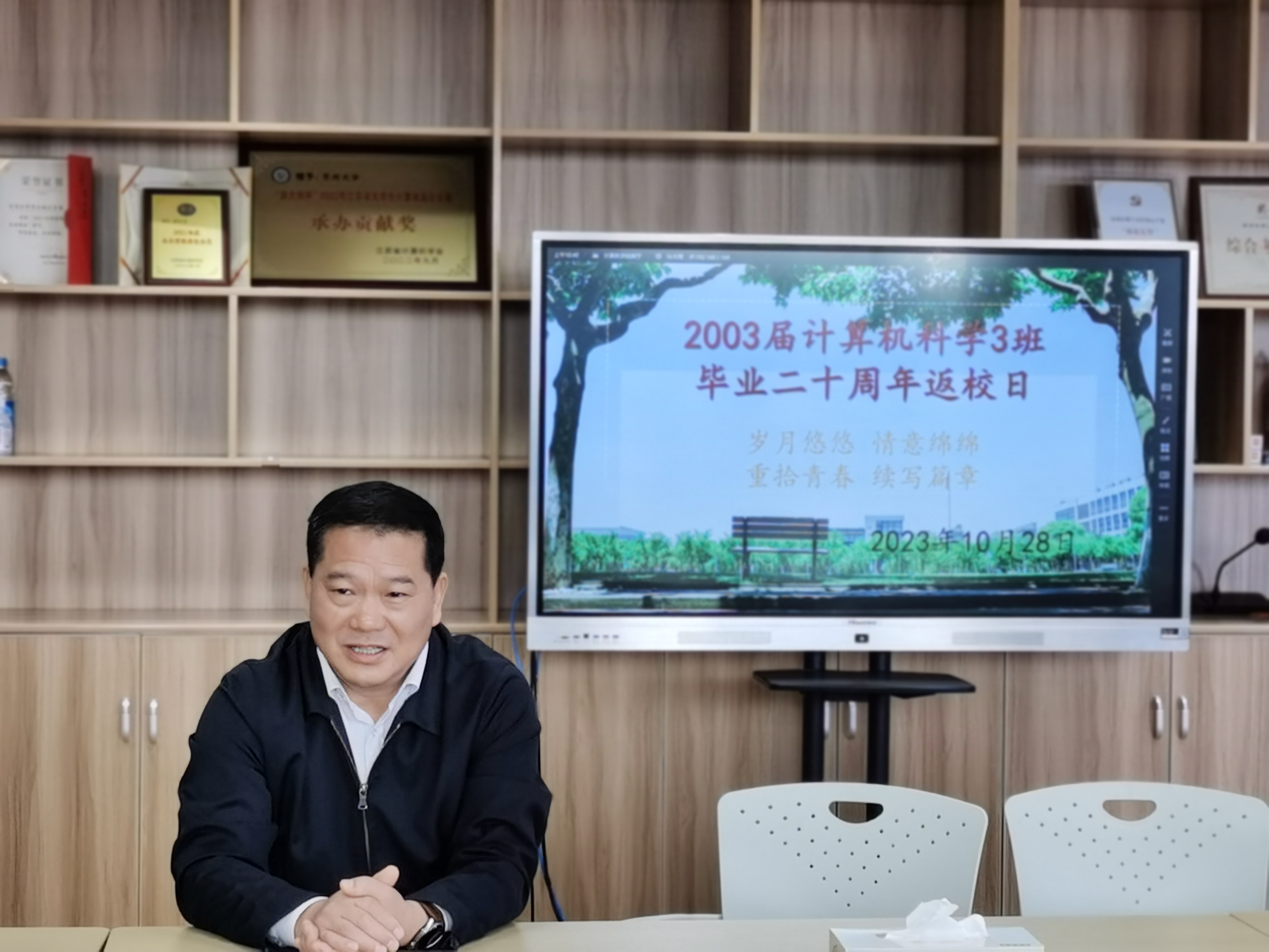 2023年10月28日,2003届计算机科学3班正值毕业二十周年。这一特殊时刻,理工楼214会议室汇聚了班级的部分校友,他们从周边城市赶来,再次踏上国产a片 校园的土地,举行了一场毕业二十周年返校座谈会,以庆祝友情、成就和回忆的二十年。本次活动,国产a片 党委书记胡新华老师、软件国产a片 副院长,分管校友工作俞莉莹老师一起参加了校友座谈会。