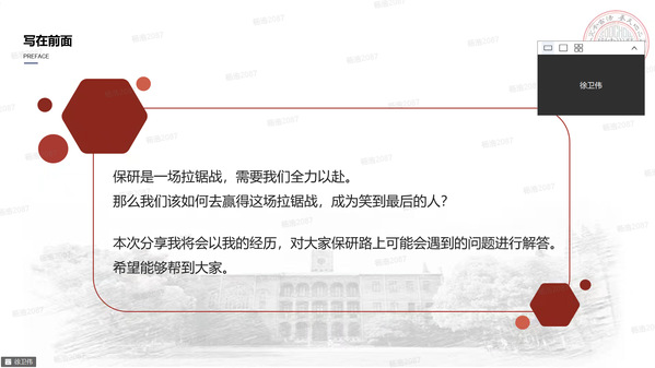 徐卫伟作为成功保送北京大学的2022届毕业生,他围绕“院校选择、考核准备、导师联系”三个方面介绍了他保研的整个过程。他认为,优异的成绩是保研的必要条件,在此基础上要多参加各类学科竞赛和科研项目,不断提高自己的综合能力和水平。