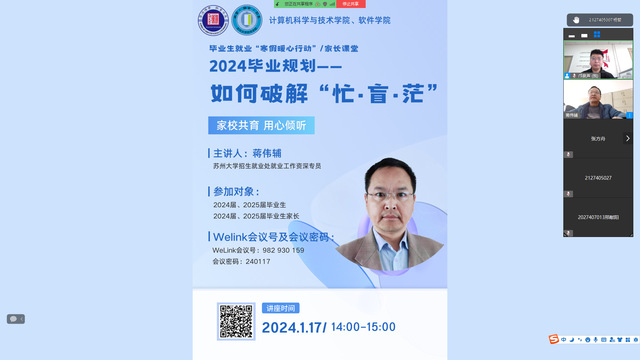 为进一步做好2024届寒假期间毕业生就业工作,为毕业生提供不间断就业服务,促进毕业生高质量充分就业,破解学生就业的“忙·盲·茫”,2024年1月17日下午14:00,计算机国产a片 2024届毕业生就业“寒假暖心行动”之毕业规划暨家长课堂活动顺利举行。
