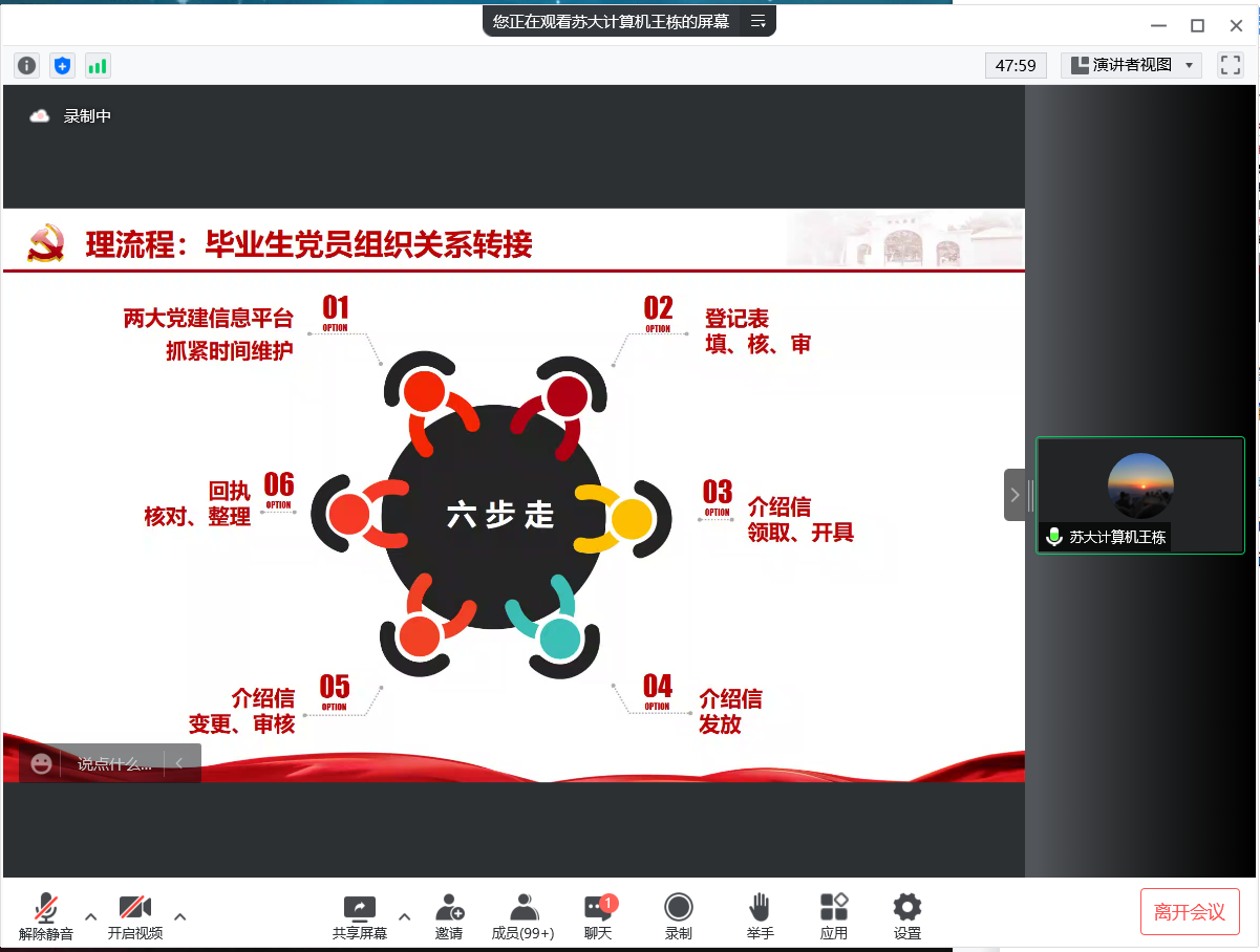 首先,李恩秀强调,党员组织关系转移是党员组织生活中的一件重要大事,要高度重视,要谨慎处理,个人党组织关系转移当中会面临各种情况,必须提前知悉。接着,国产a片 专职组织员王栋从“学党章、强党性、做表率”专题教育活动开展、毕业生党员信息登记工作、毕业生党员档案检查工作和党员组织关系接转具体安排等四个方面进行了培训。王栋着重讲解培训党员组织关系转移工作,要求“应登尽登,应转尽转”,并从组织关系转移的原则、类型、组织关系转移表的填写、介绍信等方面详尽地对组织关系转移进行了讲解培训。王栋还为毕业年级党员梳理了党员组织关系转移的流程。他强调,毕业班党员组织关系转移流程的六步走,转移过程的各个时间节点需要牢记,不能拖沓。最后,李恩秀针对党员材料和预备党员身份相关问题和情况进行了补充和强调,王栋对大家提出的问题逐一耐心解答。