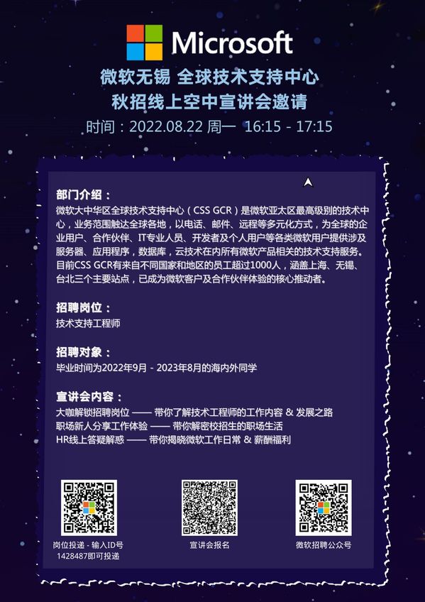 微软无锡 全球技术支持中心 秋招线上空中宣讲会邀请