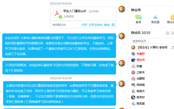 春学期,受疫情影响,学生均居家学习,网络成为成长陪伴的主要依托。在此期间,各小组借用线上会议平台、聊天平台、在线文档等线上工具,开展了丰富多彩的活动。另外,涉及贫困生的小组,还对贫困生个人进行了电话关心或云端家访,了解学生的生活、学习、心理状态,针对性进行帮扶。