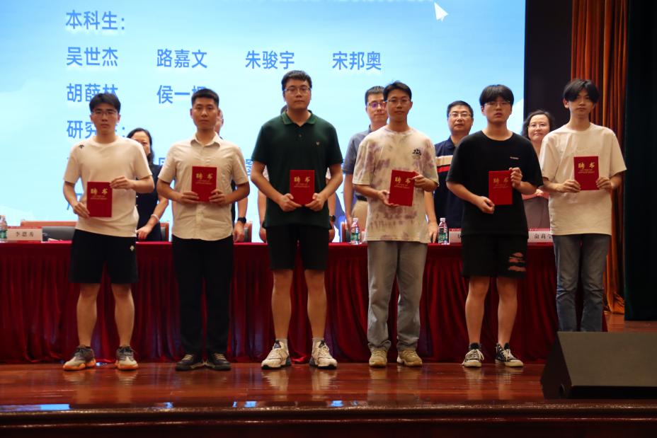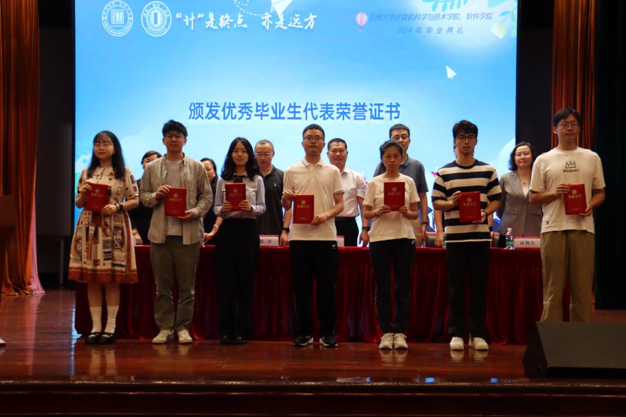 在典礼开始之前,全体与会人员观看了毕业纪念视频,视频记录了同学们在东吴校园里的点点滴滴。那些昔日学习生活的片段,如同一幅幅动人的画卷,细腻地勾勒着青春的轮廓,引发大家回忆激情难忘的光辉岁月。在庄严的国歌声中,毕业典礼正式拉开帷幕。赵雷宣读了本科生考取和推免硕士研究生、硕士生考取博士研究生名单;刘纯平宣读了2024届优秀本科及硕士毕业生名单;俞莉莹宣读了2024届校友联络员名单。全体院领导为优秀毕业生及校友联络员颁发证书、聘书并合影留念。