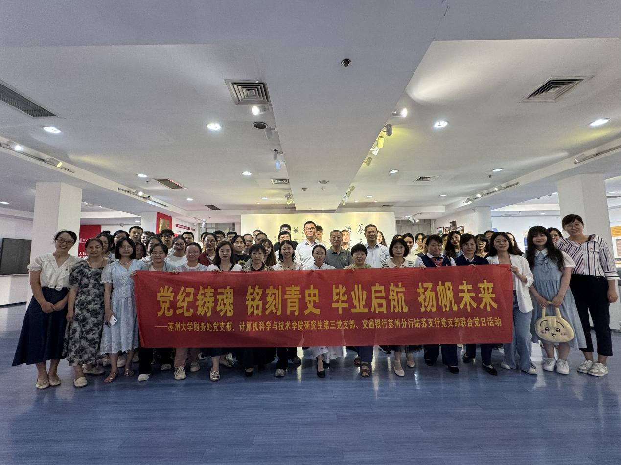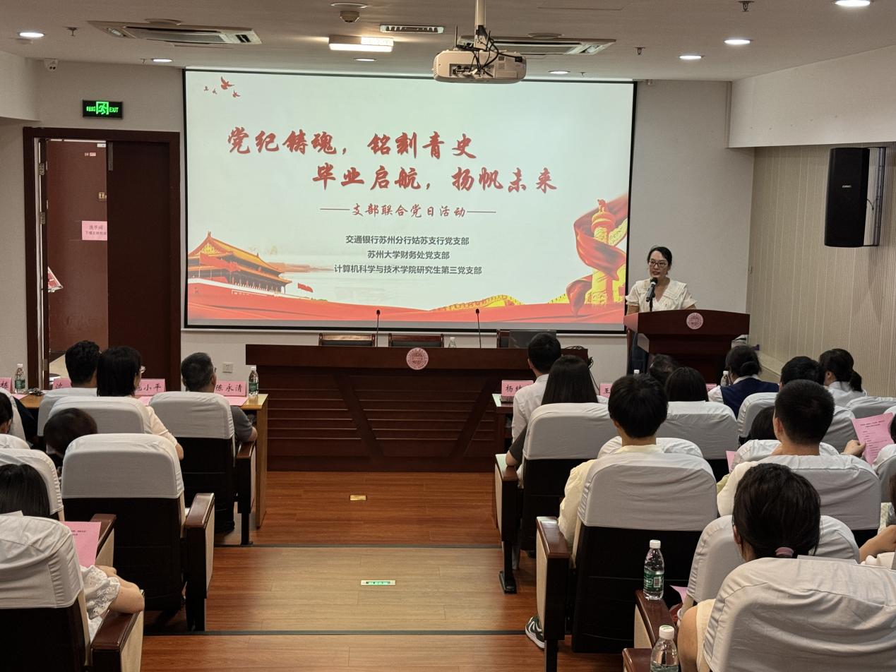 为加强党员纪律教育,传承党的光辉传统和优良作风,激励毕业生党员不忘初心、牢记使命,以更加坚定的信念和昂扬的姿态迈向社会。6月19日下午,国产a片 研究生第三党支部与国产a片 财务处党支部、交通银行苏州分行姑苏支行党支部联合开展党纪学习教育主题党日活动。国产a片 党委书记胡新华,国产a片 党委委员、组织员王栋,国产a片 财务处处长、党支部书记陈永清,财务处副处长、支部纪检委员施小平,财务处副处长沈军,交通银行姑苏支行副行长杨绪宽,交通银行苏大支行行长王玮寅以及研究生第三党支部、财务处党支部、交通银行苏州分行姑苏支行党支部党员参加了本次活动。活动由研究生第三党支部书记高珊主持。