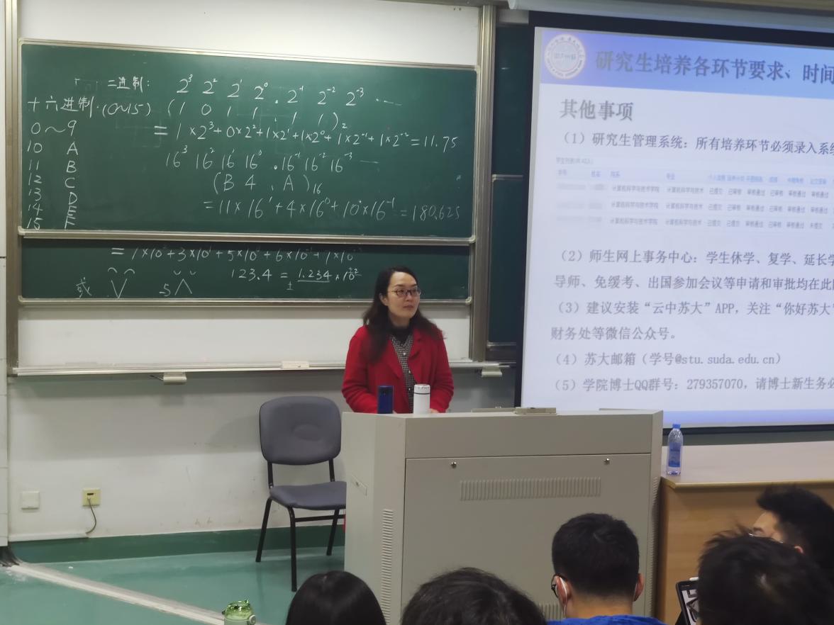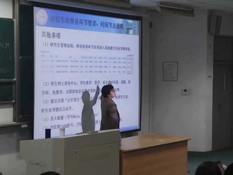 大会第一项议程是由国产a片 教务秘书何倩老师为大家介绍研究生培养的相关事务。何老师主要讲了研究生期间培养各个环节要求,包括一些重要时间节点,研究生管理系统的相关内容等。向大家详细阐述了研究生期间尤其是培养、科研环节的重要事项,为大家领航。