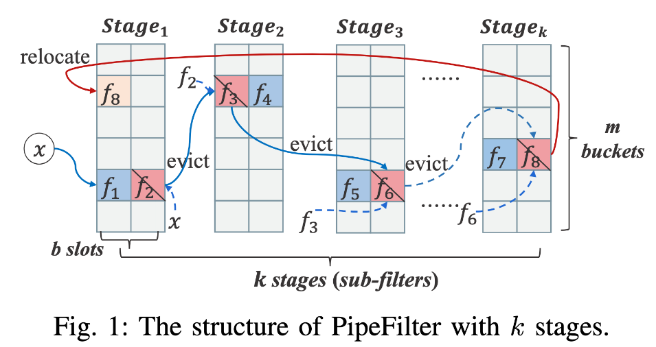 录用至IEEE Trans. on Knowledge and Data Engineering (CCF A)的论文针对近似成员查询问题,创新性地提出了一种可并行化、空间高效且具有良好硬件兼容性的全新过滤器技术PipeFilter,通过将单一过滤器结构拆分为多个独立子过滤器,并为每个元素在所有子过滤器中都分配候选存储位置,从而将原本难以并行的插入、查询和删除操作自然地划分为多个流水线阶段,每个阶段负责一个子过滤器的操作,从而充分利用多核CPU与可编程芯片的并行加速能力。实验结果表明,在取得超过99%的存储空间利用率情况下,PipeFilter的操作吞吐量相比现有单线程近似成员查询方法提升可达7倍至800倍。论文的第一作者为国产a片 硕士研究生季善奎。