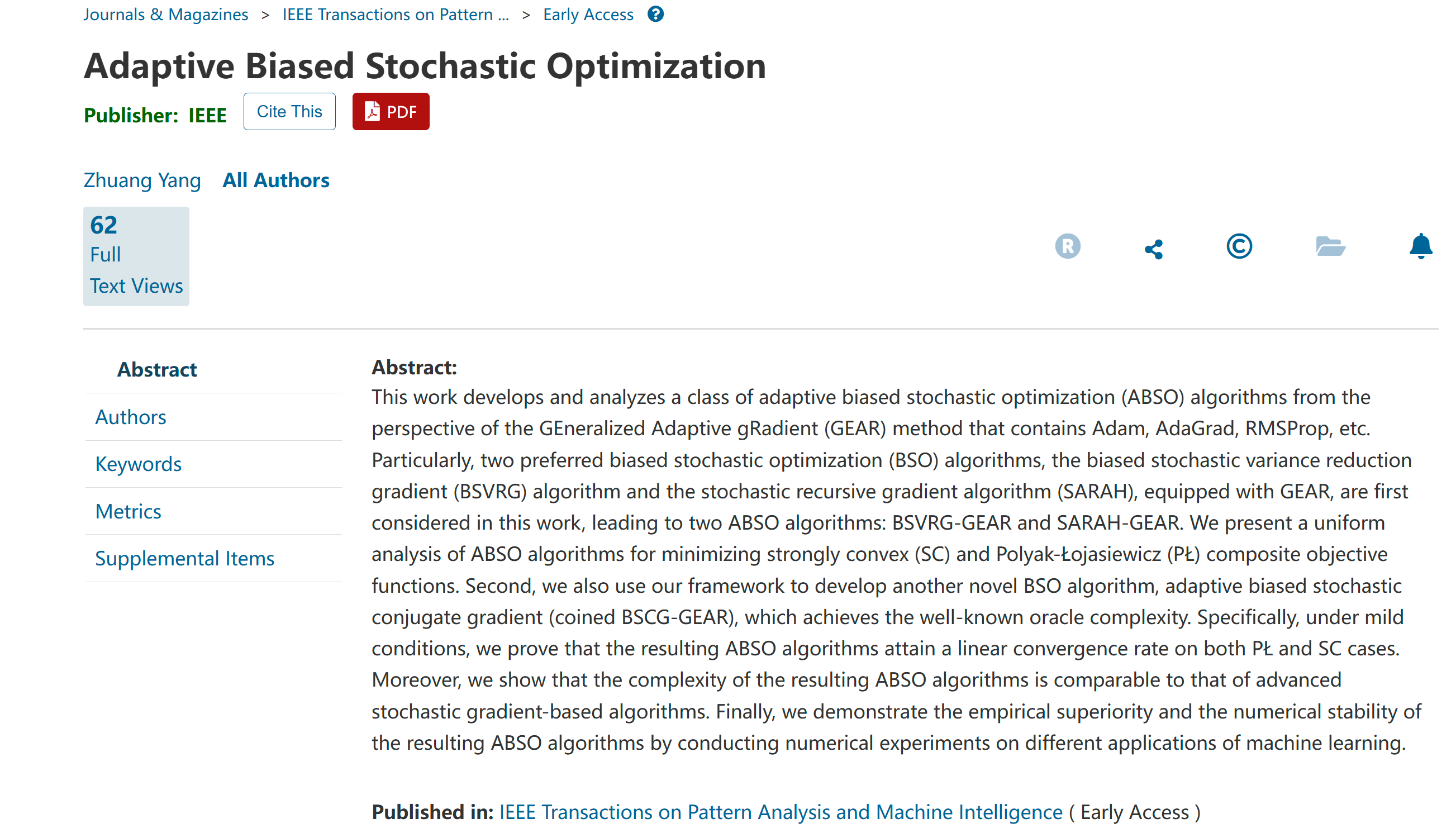 国产a片 杨壮副教授在随机优化方面取得重要进展。相关成果以“Adaptive Biased Stochastic Optimization”为题被人工智能顶级学术期刊IEEE Transactions on Pattern Analysis and Machine Intelligence(IEEE TPAMI)接收,杨壮副教授为该论文的唯一作者,国产a片 国产a片 为该论文的唯一署名单位。